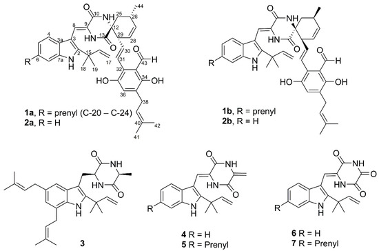We first evaluated the cytotoxicities of 1–7 and found that 1a, 1b, 2, 3, 6, and 7 were noncytotoxic to Neuro-2a cells at concentrations up to 100 µM (Table S1), while 4 and 5 showed moderate cytotoxicities with IC50 values of 50.9 and 40.6 µM, respectively (Table S1). Note that 4 was reported to be cytotoxic against murine macrophage RAW264.7 cells with a potency similar to that reported here [20]. Our results support the idea that the α,β-unsaturated carbonyl moiety in 4 and 5 control the toxicity of these molecules [21]. Of note, compounds 3 and 7 were moderately cytotoxic against human drug-resistant and drug-sensitive prostate cancer cells (Table S1). Echinulin (3) exhibited moderate cytotoxicity towards 22Rv1, PC-3, and LNCaP cells with IC50 values of 63.2, 41.7, and 25.9 µM, respectively. Neoechinulin (7) showed similar activities with IC50 values of 49.9, 63.8, and 38.9 µM, respectively.