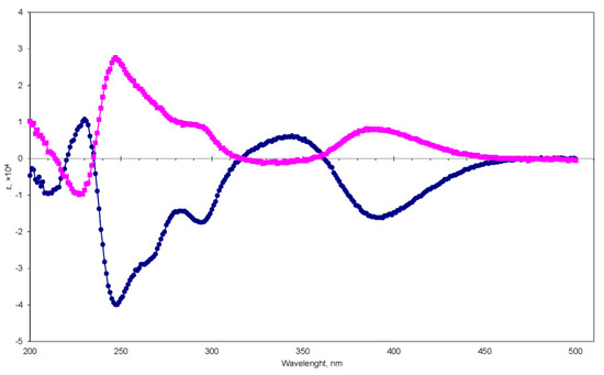 CD curves of 1a (magenta, ■) and 1b (blue, ●).
