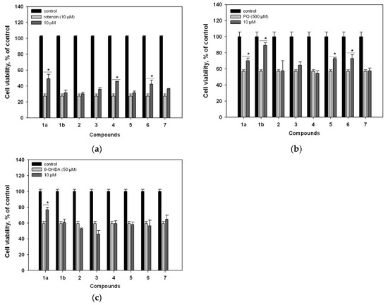 Effects of compounds 1–7 on the viability of Neuro-2a cells treated with rotenone (a), PQ (b), and 6-OHDA (c). Cells were pretreated with 10 µM of the tested compound (1–7) for 1 h, and then the neurotoxin was added. * Statistically significant difference (p ≤ 0.05, Student’s t-test).