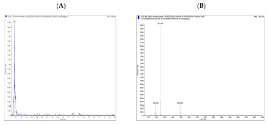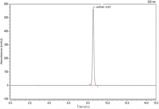 Osthole (7-methoxy-8-isopentenylcoumarin): is a white solid with the molecular formula C15H17O3, as identified by high-performance liquid chromatography (HPLC) (Figure 1), proton nuclear magnetic resonance (1H-NMR), carbon-13 nuclear magnetic resonance (13C-NMR) (Figure 2), and high-resolution mass spectrometry (HR-MS) spectra (Figure 3). As indicated by Figure 1, the purity was greater than 98%. The spectral data was identical to that previously reported in the literature [26].