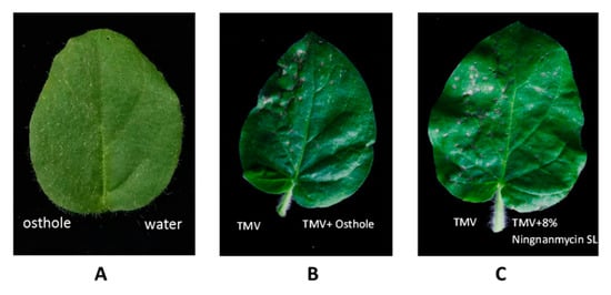Anti-tobacco mosaic virus (TMV) activities of osthole in N. glutinosa. The half-leaf was smeared with osthole extract mixed with TMV at the same volume, and the right half-leaf was smeared with 40 µL of TMV. (A) Osthole extract (5 mg/mL) and water. (B) Osthole extract (5 mg/mL) and TMV. (C) Ningnanmycin SL (8%; 1000-X dilution) and TMV.