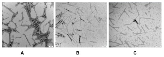 Electron microscopic observation of TMV particles after treatment with osthole for 45 min. The concentration of the purified TMV was 0.60 mg/mL. The sample was observed under 49,000× magnifications using a Hitachi H-600 Electron Microscope. (A) Normal TMV particles. (B) TMV treated with osthole at 3 mg/mL for 45 min. (C) TMV treated with osthole at 5 mg/mL for 45 min.