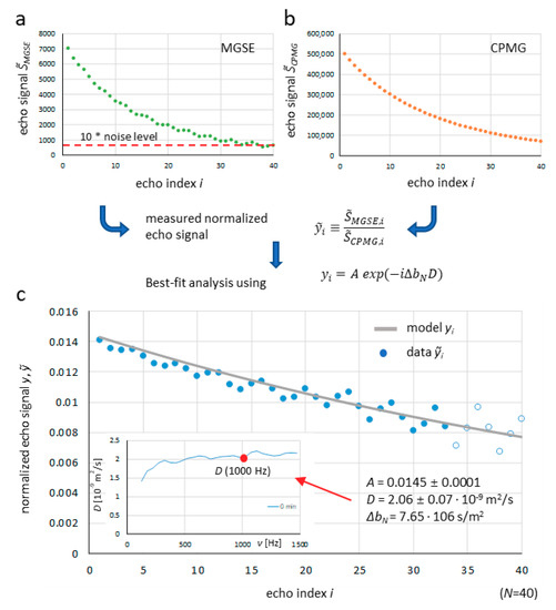 The diffusion spectra were measured using the constant gradient MGSE method, which has been elucidated in the previous study [29]. Briefly, this method uses a Carr–Purcell–Meiboom–Gill (CPMG) multi spin-echo pulse sequence [34,35] that produces a series of N spin-echoes. If the sequence is performed without the magnetic field gradient, then the echoes decay exponentially because of the transversal NMR relaxation. The attenuation of the i-th echo is then equal to