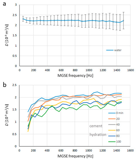 In this study, the constant gradient MGSE method was tested for acquisition of the diffusion spectra, first on a sample with unrestricted diffusion and then on a sample with restricted diffusion. The latter was a hydrating white cement paste sample. Due to the cement hydration process, the porous structure of the sample changed with time. This process was followed by the sequential acquisition of the diffusion spectra, which were also analyzed by the corresponding mathematical model function, and the model parameters were extracted for each spectrum using the best-fit model analysis. In comparison to our previous MGSE studies [11,14,29,30], which were mainly theoretical or advocated the proof of concept, this is the first MGSE study aiming to more practical applications of the method for the construction materials. The MGSE technique has a clear advantage of acquiring spectral information over the traditional methods for the assessment of cement hydration, e.g., hydration heat under isothermal condition [31]. The diffusion coefficient is measured in the range of frequencies corresponding to different dynamics of translational molecular motion.