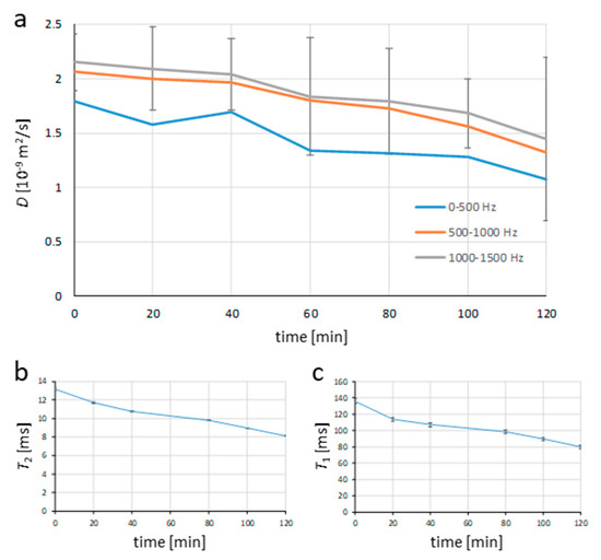Cement hydration process followed by time courses of (a) diffusion, (b) transversal NMR relaxation time, and (c) longitudinal NMR relaxation time. Diffusion was followed for three different frequency regimes: low, with frequencies up to 500 Hz, medium, with frequencies between 500 and 1000 Hz and high, with frequencies between 1000 and 1500 Hz.