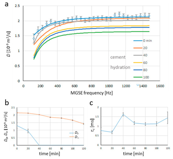 Best-fit analysis using the model for diffusion spectra (Equation (6)) and the measured data (Figure 2b) yields: (a) modeled diffusion spectra for different times after the onset of cement hydration and the corresponding model parameters, (b) diffusion constant in the for zero-frequency diffusion limit D0, and in the high-frequency diffusion limit D∞, and (c) characteristic time τc.