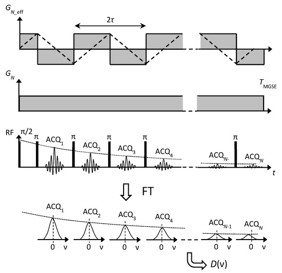 Modulated gradient spin-echo (MGSE) pulse sequence along with a scheme of the zero-frequency processing of data. The Carr-Purcell-Meiboom-Gill (CPMG) radiofrequency (RF) pulse train superimposed to a constant magnetic field gradient GN results in an oscillating effective gradient GN_eff. The signals for all the N spin-echoes that are interspaced by time τ are acquired, and then Fourier transformed from the time to the frequency domain. This is followed by a selection of zero-frequency values representing each echo.