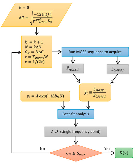 In order to measure a complete diffusion spectrum, it must be analyzed at several different frequencies that uniformly cover its frequency range. This can be done using the measurement procedure explained in the flowchart diagram in Figure 6. Briefly, in this procedure, the constant gradient MGSE sequence followed by the corresponding CPMG sequence is repeated with a gradually increasing number N of refocusing RF pulses, where N increases in steps of ΔN equal to the multiples of two. In all these measurements, the pulses are performed at always the same time, such that the MGSE frequency is gradually increasing. So in each frequency step, the measured echoes are first normalized ; i.e., echoes measured with the magnetic field gradient are divided with the corresponding echoes measured without the magnetic field gradient . The normalized measured echoes are then analyzed by the model function in Equation (3) to obtain best-fit model parameters A and D. Here, D corresponds to the value of the diffusion spectrum at the measured MGSE frequency. Since the fit quality depends on the signal to noise ratio of the input data, the gradient amplitudes are readjusted in each frequency step to so that they always produce the same signal attenuation f in time for a predicted diffusion coefficient (as defined in Figure 6). The measurement procedure ends with the diffusion spectrum measured when it exceeds the maximum gradient of the NMR system (or earlier).