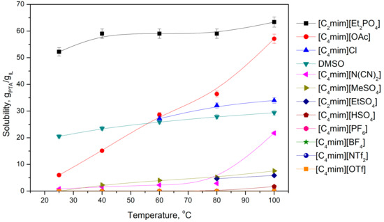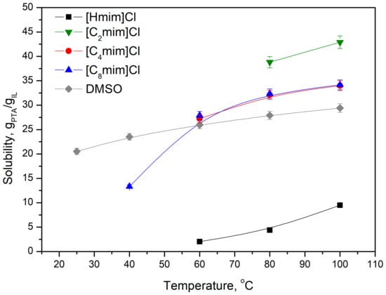 IL, 100 °C). All other tested ionic liquids exhibited lower solubility than DMSO. It can be concluded that the highest solubilities of PTA were found in ionic liquids that were aprotic, contained Lewis base properties (similar to DMSO [