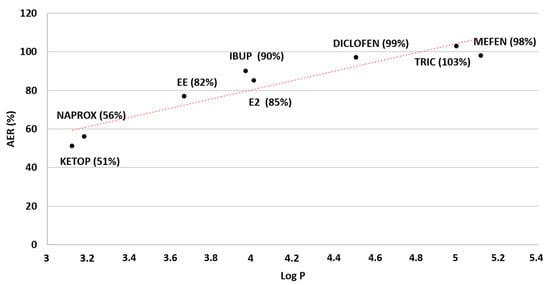 | Analyte | Linear Range (ng mL−1) | R 1 | LOD 2 (ng mL−1) | LOQ 3 (ng mL−1) | LogP a | AER 4 (%) | Precision (Exp. as RSD% 5) | EF 6 |
