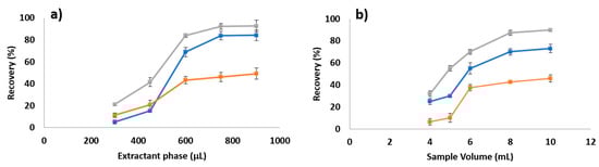 The effect of the volume of extractant phase (300–900 μL) on the extraction performance was evaluated. As observed in Figure 2a, maximum recovery values were obtained for 750 μL of extractant phase (375 μL of extraction solvent), being constant up to 900 μL. Lower extractant phase volumes (300 μL, corresponding to 150 μL of extraction solvent) resulted in an unfeasible phase recovery, and subsequently, poor extraction recovery was observed. As a result, 750 μL of extractant phase was selected for the subsequent optimization experiments.