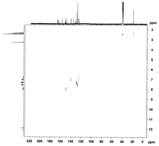 In the present study, the spectral data were measured in a DMSO-d6 solution. For these compounds, we observed in 1H-NMR and 13C-NMR signals belonging to Z and E geometrical isomers about the C=N double bond, which is characteristic of arylidene-hydrazide structure [21,22,23,24,25]. In addition, the compounds with this structure may exist as cis–trans amide conformers [26,27,28]. What is more, we have done 1H-13C NMR correlations (Figures S41–S50) for all compounds, which confirmed the presence of isomers. The correlation spectrum of the proton and carbon in the most active compound 3 (Figure 1) allows us to determine the presence of double signals from geometric isomers.
