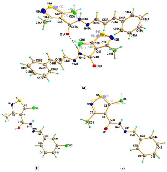 X-ray structures of 3 (a) (the dotted line indicates N-H…O hydrogen bond which linking together both independent molecules—denoted as A and B), 4 (b) and 8 (c), with atom-numbering scheme. Displacement ellipsoids are drawn at the 50% probability level. H atoms are shown as small spheres of arbitrary radii. For compounds 2 and 3, atoms and bonds from a disordered isothiazole ring with a lower occupancy factor were marked with a transparency of 0.6.