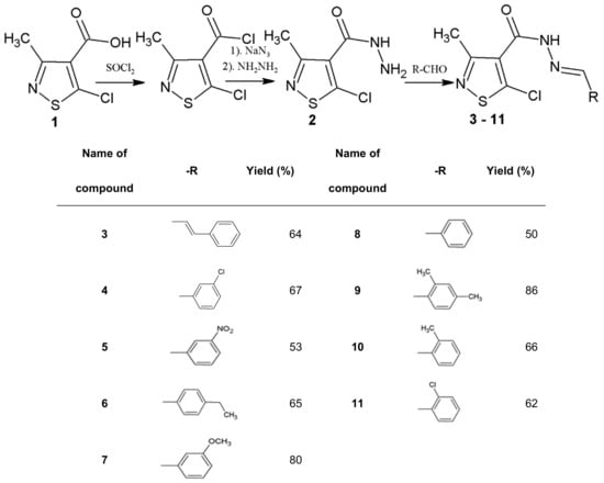 The N’-substituted 5-chloro-3-methylisothiazole-4-carboxylic acid hydrazide derivatives 3–11 (Scheme 1) were obtained by the nucleophilic addition reaction in yields ranging from 50% to 86%. The new derivatives were obtained in the reaction 5-chloro-3-methylisothiazole-4-carboxylic acid hydrazide 2 with the corresponding carbonyl compounds heated at a temperature of 78 °C while being stirring vigorously for 4 h in ethanol. The synthesis took place according to the nucleophilic addition mechanism consisting of the attachment of 5-chloro-3-methylisothiazole-4-carboxylic acid hydrazide 2 to the carbon bond of the C=O carbonyl group to form a carbanion. The next step was the elimination of a water molecule and creation of an imine bond.