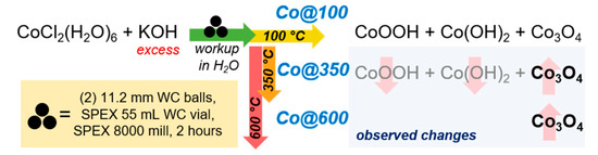 In a tungsten carbide (WC) vial, CoCl2(H2O)6 (4.2 mmol, 1.0 g) was mixed with excess KOH (89 mmol, 5 g) and (2×) 11.2 mm WC balls. The vessel was sealed, and placed on a SPEX® 8000 mill and allowed to react for 2 h after which point it was opened and the dark brown powder washed with 100 mL of DIW, passed through a medium glass filter frit to remove large particulates, and centrifuged at 3500 rpm for 3 min. to afford a dark bronze solid. The solid was dried in vacuo at 100 °C for 4 h to remove the remaining H2O, yielding 387 mg of dark brown/black powder. The resulting powder was split in three (129 mg each), one portion was kept “as synthesized” (Co@100) and the remaining two heated to 350 °C (110 °C h−1 for 3 h, hold 2 h at 350 °C) and 600 °C (110 °C h−1 for 5 h, hold 2 h at 600 °C), respectively (Co@350 and Co@600, Figure 2). Unless otherwise noted, samples were stored in sealed vials in a desiccator (10% RH).