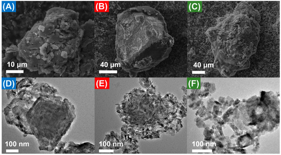 Scanning electron microscopy (SEM) of the powders in each instance revealed an amorphous agglomeration of micron-sized particles of compacted material decorated in highly dispersed nano-to-micron sized semi-spherical clusters (Figure 3A–C and Figure S1) [64,65,66]. The large agglomerates are attributed to the impacts from the preparative method. Energy dispersive X-ray spectroscopy (EDX) confirms the presence of Co as the predominant species, with residual K from the milling process (Figure S1). Transmission electron microscopy (TEM) of all three samples after prolonged sonication in methanol at 40 °C, to enable decomposition of the micron-sized agglomerates, reveals agglomerated nanoplates ranging anywhere between <10 nm to >50 nm (Figure 3D–F and Figure S2). Nanoplate definition is greatly enhanced for Co@600 (Figure 3F), commensurate with higher crystallinity and formation of a predominantly single Co-oxide species (vide infra).