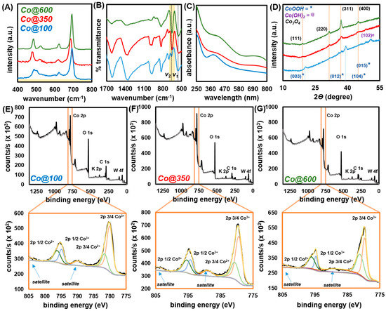Raman (A), FTIR (B), UV-Vis (C), and XRD (D) spectra of Co@100, Co@350 and Co@600. (a.u. = arbitrary units). XPS survey and close-up of Co 2p region for (E) Co@100, (F) Co@350, and (G) Co@600.