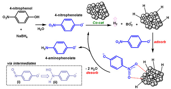 Proposed general mechanism for the reduction of 4NP with catalysts Co@100, Co@350, and Co@600 in H2O with excess NaBH4.