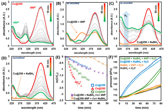 (A) UV-Vis spectra for the reduction of 4NP by Co350; (B) Co@350 and 4NP, dwell 5 min, then, NaBH4 addition; (C) Co@350 and NaBH4, dwell 5 min, then 4NP addition; (D) spectrum (C) normalized at 250 nm; (E) plot of ln(C/Co) as a function of time; and (F) change in pressure associated with the evolution of H2 in closed system (repeat trials shown).