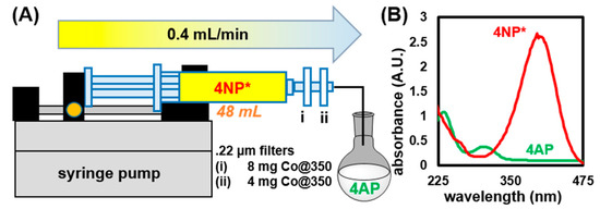 (A) Schematic illustration of a model flow reactor for reduction of 4NP* to 4AP. (B) UV-Vis spectrum of 4NP* and the resulting 4AP collected after passage through filters loaded with Co@350.