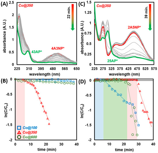 (A) UV-Vis spectra of the reduction of 4A3NP by Co@350 (SI for Co@100 and Co@600) and (B) plot of ln(C/Co) as a function of time for the reduction of 4A3NP by Co@100, Co@350, and Co@600. (C) UV-Vis spectra of the reduction of 2A5NP by Co@350 (SI for Co@100 and Co@600) and (D) plot of ln(C/Co) as a function of time for the reduction of 2A5NP by Co@100, Co@350, and Co@600. Note, color blocks represent induction times.