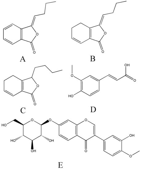 Chemical structures of butylidenephthalide (A), ligustilide (B), senkyunolide A (C), ferulic acid (D) and calycosin-7-O-β-d-glucoside (E, IS).