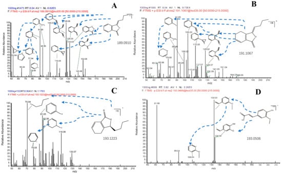 The fragment mass spectrometry (MS/MS spectrometry) of butylidenephthalide (A), ligustilide (B), senkyunolide A (C) and ferulic acid (D).