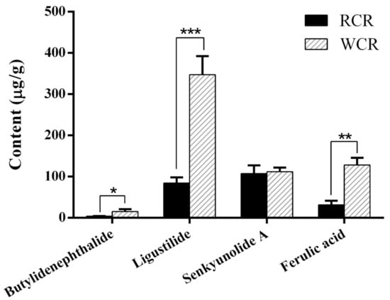 The contents of butylidenephthalide, ligustilide, senkyunolide A and ferulic acid in oral liquid medicine of RCR and WCR have been determined firstly in our study, there were 4.05, 84.46, 107.12 and 31.30 µg/g respectively in oral liquid medicine of RCR, while 15.21, 347.48, 111.91 and 128.13 µg/g respectively in oral liquid medicine of WCR. The results showed that the progress of wine processing can cause a significant increase (about a three-fold increase) in the butylidenephthalide, ligustilide, and ferulic acid content of WCR. The contents of butylidenephthalide, ligustilide, senkyunolide A and ferulic acid in oral liquid medicine of RCR and WCR were shown in Figure 3.