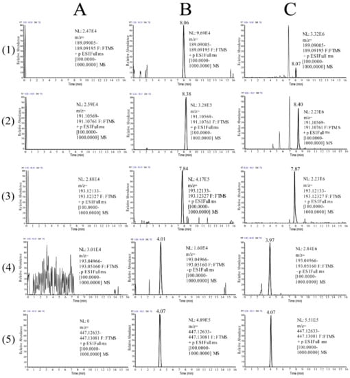 Representative chromatograms of butylidenephthalide (1), ligustilide (2), senkyunolide A (3), ferulic acid (4) and calycosin-7-O-β-d-glucoside (IS) (5) in rat plasmas: (A) blank plasma samples; (B) blank plasma samples spiked with butylidenephthalide, ligustilide, senkyunolide A, ferulic acid at linearity and lower limit of quantitation (LLOQ) and IS; (C) plasma samples obtained at 1 h after oral administration of RCR at a dose of 24.01 g/kg.