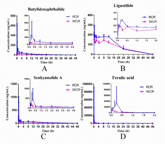 Mean (n = 6) plasma concentration–time curves of butylidenephthalide (A), ligustilide (B), senkyunolide A (C) and ferulic acid (D) after oral administration of RCR and WCR.