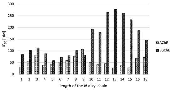 Analogous “oscillating” activity without one dominant trend depending on alkyl chain length has been described previously, e.g., by Imramovský et al. [17]. There are many factors influencing inhibition of AChE and BuChE, not solely the length of n-alkyl chain, e.g., such as lipophilicity, electronic and steric effects. Moreover, inhibitors of AChE can interact with more enzyme “subsites”, either with one or with more at once. They may interfere with peripheral anionic site, catalytic esteratic subsite (competitively, irreversibly or pseudo-irreversibly), anionic site in the active site, or they can bind into a narrow aromatic gorge, thus preventing access of the substrate to the catalytic triad [18]. Based on the alkyl length, a change of fitting into enzyme can occur. The alkyls that are flexible may also adopt a conformation that allows a better interaction with the enzyme.