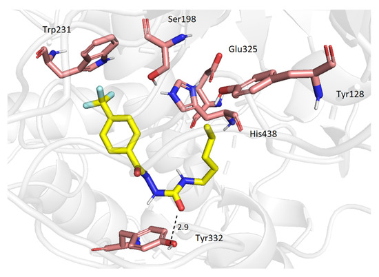 Concerning BuChE, all the presented compounds displayed a similar orientation in the active site of BuChE, regardless of the growing size of their molecules. This may be due to a relatively spacious cavity of BuChE compared to the one in AChE. However, the derivative 2e displayed only a few detectable interactions, namely H-bond with Tyr332 and CF-π with Trp231 (Figure 4). Nevertheless, the ligand possesses the ability to block the catalytic triad completely.