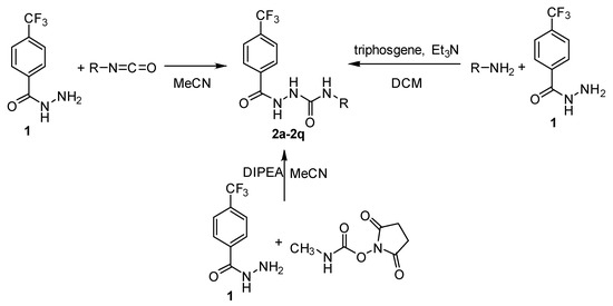 Analogously to our previous works [11,12], hydrazine-1-carboxamides were obtained using three synthetic approaches. Most of the derivatives (2b–2i, 2k, 2l, 2n, 2p–2q) were prepared from commercially available isocyanates and the hydrazide 1 in acetonitrile. This reaction (method A) is simple, quick and it provides high yields, up to quantitative ones (89–99%). For the synthesis of N-decyl, tridecyl and pentadecyl derivatives 2i, 2m and 2o, where the required isocyanates were not commercially available, we prepared them in situ using the corresponding amines and triphosgene in the presence of triethylamine (TEA) under a nitrogen atmosphere, followed by addition of the hydrazide 1. The yields of this method B ranged from 78% to 91%. Finally, for the synthesis of N-methyl derivative 1a, N-succinimidyl N-methylcarbamate in the presence of a non-nucleophilic tertiary base (N,N-diisopropylethylamine, DIPEA) was used as a non-toxic and crystalline methyl isocyanate substitute (method C with a good yield of 77%). An overview of the synthetic approaches used is depicted in Scheme 2.