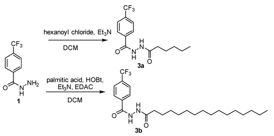 Based on the antimycobacterial activity of the derivative 2f, we decided to prepare several its analogues. First, we investigated the 1,2-diacylhydrazines 3 (Scheme 3), i.e., derivative with no secondary amine group. The N´-hexyl derivative 3a was prepared via direct acylation from the 1 and hexanoyl chloride in the presence of base (TEA; yield 79%). In order to investigate the length of the acyl chain, also N´-hexadecanoyl derivative 3b was synthesized using carbodiimide (EDAC)/1-hydroxybenzotriazole (HOBt)-mediated coupling (97%).