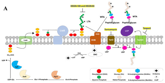 Teichoic acids are abundant throughout the cell envelopes of Gram-positive bacterial pathogens such as S. aureus, enterococci, Listeria monocytogenes, Streptococcus pneumoniae, and Bacillus subtilis [5]. Teichoic acids are divided into two classes: lipoteichoic acids (LTAs) and wall teichoic acids (WTAs) (Figure 1A). Both LTA and WTA play major roles in Gram-positive bacterial cell processes that are vital to their survival [5]. Specifically, LTA is an anionic 1,3-glycerolphosphate containing polymer anchored to the cell wall while WTA is a cell surface glycopolymer that is covalently linked to peptidoglycan and expands beyond the cell wall [6,7]. Both LTA and WTA are very important for bacterial growth, cell wall physiology, membrane homeostasis, and virulence [8]. Regarding biofilm formation, both LTA and WTA are vital. For instance, teichoic acids lacking d-alanine showed decreased colonization of both MRSA and VRE, as well as reduced adherence of these bacterial pathogens to nasal epithelial cells [9,10,11]. Both LTA’s and WTA’s important roles in biofilm formation have been linked to disruption of the negative charge of the bacterial cell wall resulting in altered hydrophobicity [12]. Therefore, both LTA and WTA can be potential targets in the development for new antibacterial agents against biofilm forming Gram-positive infections.