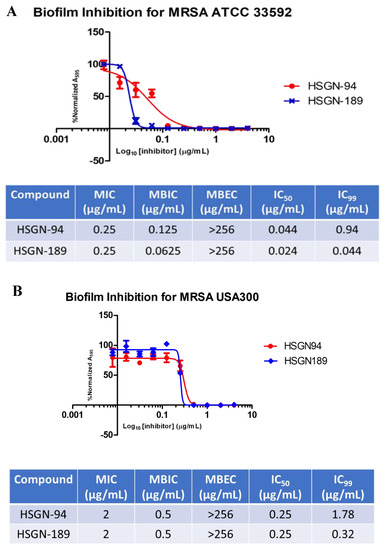 (A) Biofilm Inhibition Curves for HSGN-94 and HSGN-189 against MRSA ATCC 33592. (B) Biofilm Inhibition Curves for HSGN-94 and HSGN-189 against MRSA USA300. (C) Biofilm Inhibition Curves for HSGN-94 and HSGN-189.