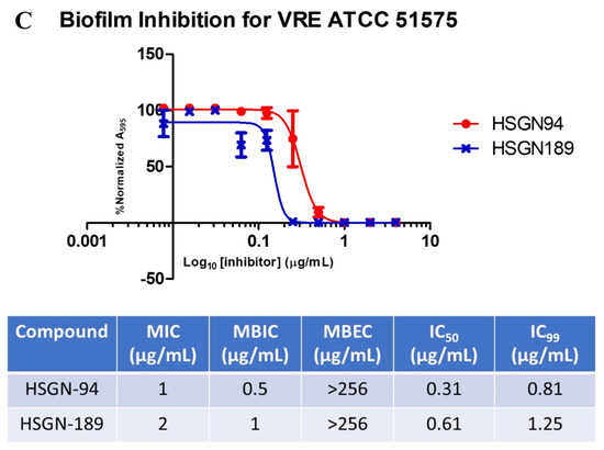 The synthesis and characterization of both HSGN-94 and HSGN-189 have been previously described [19]. Additionally, HSGN-94 and HSGN-189 were found to have potent antibacterial activity against both MRSA and VRE with MICs as low as 0.25 µg/mL and 1 µg/mL, respectively. Furthermore, both compounds proved to be the most potent LTA biosynthesis inhibitors published [19]. As mentioned above, since LTA plays a major role in biofilm formation of both MRSA and VRE, we aimed to test whether HSGN-94 or HSGN-189 could have antibiofilm activity. Both HSGN-94 and HSGN-189 showed potent biofilm formation inhibition against MRSA and VRE with minimum biofilm formation inhibition concentrations (MBICs) at or below their MIC values. For instance, the MBIC of HSGN-94 against MRSA ATCC 33592, MRSA USA300, and VRE ATCC 51575 was found to be 0.125 µg/mL, 0.5 µg/mL, and 0.5 µg/mL, respectively (compare with MICs of HSGN-94 to these strains being 0.25 µg/mL, 2 µg/mL, and 1 µg/mL, respectively; see Figure 2). Similarly, HSGN-189 also had potent MBIC values against MRSA ATCC 33592, MRSA USA300, and VRE ATCC 51575 and was found to be 0.0625 µg/mL, 0.5 µg/mL, and 1 µg/mL, respectively, which are all below the reported MIC values (see Figure 2). Both HSGN-94 and HSGN-189 did not disperse established biofilms. Since the MBIC values of the compounds are lower than MIC (for example HSGN-189 inhibits biofilm formation of MRSA ATCC 33592 at a concentration that is 4× lower than MIC (MIC = 0.25 µg/mL and MBIC is 0.0625 µg/mL), we conclude that the mode of biofilm inhibition is not entirely due to bacterial death. We do not discount that some bacterial death also account for biofilm formation inhibition since at the MBIC concentrations, some bacterial death (not 100%) was also observed, see Figure 2A,C. Thus, it appears that although LTA is critical for initial biofilm formation, other factors are also important for biofilm maturation and persistence [21,22]. Established biofilms contain many adhesive and connective compounds, including DNA, proteins, and polysaccharide [23,24,25,26]. Thus, agents that degrade these would also be needed to eliminate established biofilms. In any case, combining LTA and WTA inhibitors with biofilm degraders, such as proteases [27], DNAses [28,29], and β-hexosaminidases [30,31] could lead to enhanced biofilm clearance and worthy of future investigations.