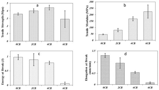 Tensile properties of gluten/CB biocomposites, (a) Tensile strength, (b) Tensile modulus, (c) Energy at Break, and (d) Elongation at break.