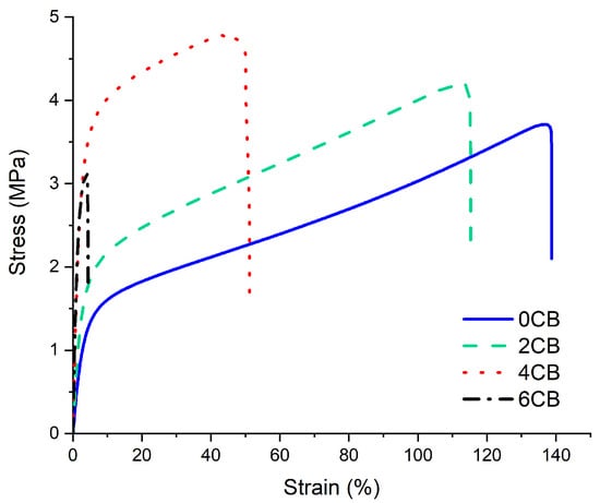 The tensile properties of different samples are presented in Figure 1. The stress vs. strain curves are shown in Figure 2. In general, tensile strengths of all the samples are quite low (ca. 3–4.5 MPa), as shown in Figure 1a, which can be attributed to the presence of glycerol in the composite. However, the strength increases moderately with the increasing CB content up to 4 wt%, where 4CB sample had the highest tensile strength at ca. 4.4 MPa. From a statistical point of view, 4CB was detected to be significantly higher than 6CB only in tensile strength, which was similar to those of 0CB and 2CB. However, 6CB demonstrates statistically comparable tensile strength to those of 0CB and 2CB, as displayed in Table 2. Nevertheless, the decrease in the tensile strength for the 6CB sample can be attributed to the large amount of CB that aggregated to cause tensile failure through an increase in stress concentration sites. In spite of being statistically insignificant, the addition of 4 wt% CB was still found to increase the tensile strength of neat WG by ca. 24%.
