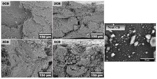 Figure 3 exhibits the SEM images of neat CB and tensile fractured biocomposites. CB particles were observed to be in the form of particle agglomerates in various sizes, some of which are in the range of several tens of micrometres, indicating that embedded CBs can be categorised as micron-sized particles rather than nanoparticles with the average particle size of 30 nm. The SEM image of 0CB without any CB particles demonstrates typical ductile fracture behaviour of gluten without any relatively stiff inclusions. The fractured surfaces of 2CB and 4CB are comparable to that of 0CB as a result of statistically similar tensile strength levels shown in Figure 1A and Table 2. However, with increasing CB content, the fracture surface became more crenelated in nature with ridges and irregular cracks. The micrographs of 2CB and 4CB did not possess so many voids associated with particle debonding, signifying more effective stress transfer from WG matrices to CB to enhance their tensile strengths as depicted in Figure 1a. The SEM image of 6CB reveals irregular matrices with many cracks along with the CB agglomerates resulting in the reduction in tensile strength of biocomposites. The surface fracture of 6CB shows large aggregates of CB (> 150 µm), which can be associated with its poor tensile strength and high rigidity. The sample 4CB only showed scattered CB aggregates, thus correlating to its higher strength, when compared to 6CB. Thus, it is evident that the optimal percolation threshold in the WG composite is at a CB concentration of ca. 4 wt% (4CB). It is clearly shown that the threshold of 6 wt% CB should not be exceeded, otherwise the wettability of fillers in biopolymer matrices would be inadequate. Similar findings regarding carbon-based fillers were reported by previous studies [,].