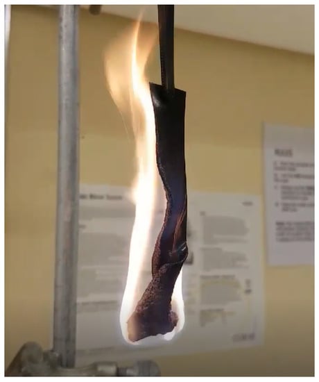 The results from the vertical burn tests are summarised in Table 6. None of the tested samples were found to have self-extinguishing capabilities, thus resulting in no rating (NR) for all materials. All the samples ignited on the first flame application and burned all the way up to the holding clamp. When the samples were burned, it dripped flaming materials to ignite the cotton below. The samples failing to get a rating in the vertical burn test can be attributed to the presence of 25 wt% of glycerol which itself is combustible (flammability rating 1) (NCBI, PubChem Database. Glycerol). The higher amount of glycerol plasticiser at 25 wt% subdued any fire-resisting effect of CB, which was added at much lower amounts. The burning behaviour of the sample is illustrated in Figure 4.