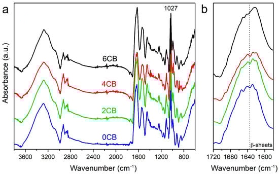 The FT-IR spectra of material samples are shown in Figure 5. No significant changes were found for biocomposites at different CB contents. The strong peak detected at 1027 cm−1 (Figure 5a) corresponds to 25 wt% glycerol contained within the composite samples []. Due to the absence of functional groups in CB, no new peaks appear in FT-IR spectra when combined with the gluten matrices []. The overall shape of the amide I region for the different composite samples (Figure 5b), was reported to be associated with conformational structures of proteins []. Here, an increase in the peak intensity for the β-sheet region in the wavenumber range of 1635–1580 cm−1 was observed among samples with increasing CB contents. The highest peak intensity detected for 6CB in Figure 5b can be mainly ascribed to more aggregated protein structures []. The shoulder from 1446 to 1416 cm−1 can be ascribed to -OH bending. This shoulder was lowest for 4CB and highest for 0CB. The former sample also had the lowest -OH interaction region (3600–3200 cm−1), in contrast to 0CB having stronger -OH interactions. The peak observed for 4CB at 880 cm−1 can be assigned to C=C bending in alkene, which could be either formed within the CB network or as the result of covalent bonding between CB and WG; this is more evident in the 4CB sample.
