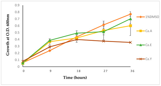 Growth kinetics of Pseudomonas aeruginosa ATCC 9721, 1% DMSO-treated, and treatments with different Calpurnia aurea extracts prepared at 1 mg/mL incubated at 37 °C for 36 h. The experiments were in triplicates and values presented are means ± standard deviation. Ca.A, Ca.E, Ca.Y—Ca denotes C. aurea, A denotes acetone, E denotes ethanol, and Y denotes ethyl acetate extracts. Negative control is the bacteria treated with 1% DMSO. O.D.: optical density.
