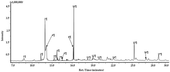 GC-MS analysis was carried out by injecting one (1) µL of sample in the splitless mode at 250 °C onto an InertCap 5MS/NP capillary (30 m × 0.25 mm × 0.25 µm; GL Sciences, Tokyo, Japan). The ion source was operated at 250 °C, and the oven temperature was programmed as follows: 100 °C holding for 3 min and increased at 10 °C/min to 180 °C and ramped up to 200 °C at 20 °C/min for 0.5 min, with a final ramp up to 260 °C at 10 °C/min and a hold for 13 min. Helium was used as the carrier gas at a flow rate of 1.0 mL/min and a velocity of 32 cm/sec. Mass spectra were recorded between 50 to 600 m/z in the electron impact (EI) ionization mode at 70 eV with a scan speed of 2300. Compounds were tentatively identified by comparing the obtained mass spectra with those from published commercial libraries NIST11 (Gaithersburg, MD, USA) and Wiley (10th edition) (John-Wiley and Sons Inc., Hoboken, NJ, USA).
