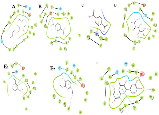 Interaction and binding of selected test compounds against the C. violaceum CviR protein active site. The negatively charged protein residues are indicated in red, polar residues are in cyan, hydrophobic residues are shown in parrot green, hydrogen interactions (H-bonds) are presented as pink/purple arrows, pi–pi stacking is shown as a green line, and the pi cation as a red line. (A)—Pentadecanol, (B)—Dimethyl terephthalate, (C)—Terephthalic acid, (D)—Methyl mannose, (E1,E2)—Vanillin, and (F)—Quercertin.