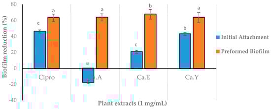 Antibiofilm activities of Calpurnia aurea extracts at 1 mg/mL against Pseudomonas aeruginosa. Ca.A—Acetone, Ca.E—Ethanol, and Ca.Y—Ethyl acetate extract. Data presented as mean ± standard deviation of three replicates, n = 3. Different letters represent statistical differences at p-value = 0.05 (GLM and LSD).