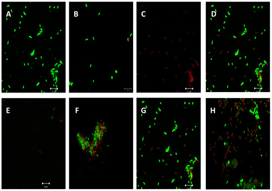 Observation of P. aeruginosa cells treated and untreated with test extracts of C. aurea ethanol, acetone, and ethyl acetate using confocal laser scanning microscopy (CLSM). (A)—P. aeruginosa ATCC 9721 cells treated 1% DMSO, (B)—Cells treated with C. aurea ethanol extract, (C)—image showing dead cells only treated with C. aurea ethanol extract, and (D)—Combination of live and dead cells treated with C. aurea ethanol extract. (E)—Cells treated with ciprofloxacin (0.06 mg/mL). (F–H) represent cells treated with ethanol, acetone, and ethyl acetate extracts, respectively. Live cells staining appear green, while dead cells show red fluorescence.