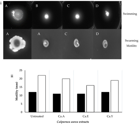 Representative images (i) and bar graph (ii) of P. aeruginosa (ATCC 9721) swimming (closed bars) and swarming (open bars) motility in the presence of various plant extracts (1 mg/mL) after 24 h at 37 °C incubation. Top row: swimming motility and bottom row: swarming motility. (A) negative control (untreated bacteria), and (B–D) represents P. aeruginosa treated with C. aurea ethanol, acetone, and ethyl acetate, respectively. Ca.E—Ethanol, Ca.A—Acetone, and Ca.Y—Ethyl acetate extracts. Data presented as averages.
