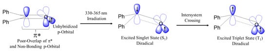Carbene spin-states can be influenced by substituents and solvent effects []. For instance, Sheridan’s group showed that 2-benzothienyl(CF3)carbene is a ground-state triplet, whereas the Platz’s group showed that in polar solvents, the 4,4′-biphenyl(CF3) carbene has a singlet ground-state and the singlet-to-triplet intersystem crossing rate depends on the coordinative capability of solvents [,]. Computational density functional studies (DFT) studies (B3LYP/6-31+G(d) and RI-CC2/TZVP; singlet excited singlet states (S1, S2, and S3) optimized with RI-CC2/TZVP) of phenydiazirine predicted the excited singlet state (S1) to be as a result of an s–p* transition [,].