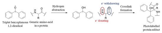 General depiction of photolabelling of protein residues (R corresponds to the amino acid side chains) by a BP. The excited triplet BP 1,2-diradical undergoes H-abstraction, leading to a stable ketyl radical and an α-carbon radical that is stabilized by the captodative effect of the electron-withdrawing carbonyl group and the electron-donating amino group. The ketyl radical and α-carbon radical recombine to form the crosslinked protein adducts.